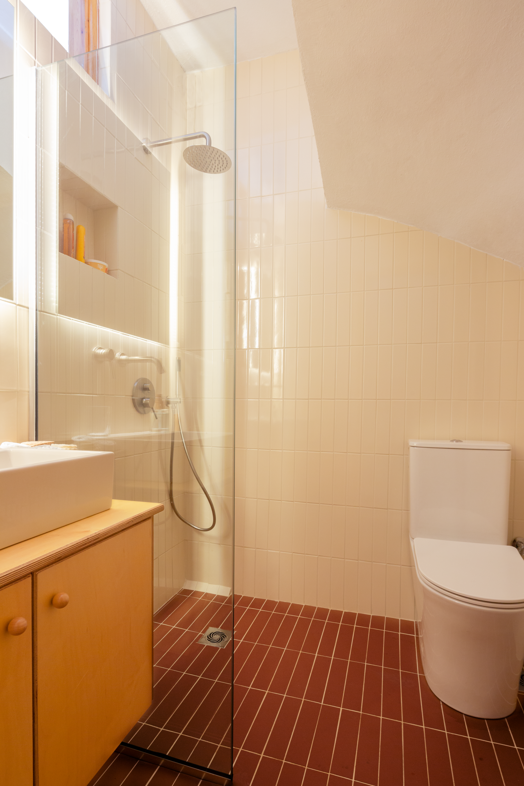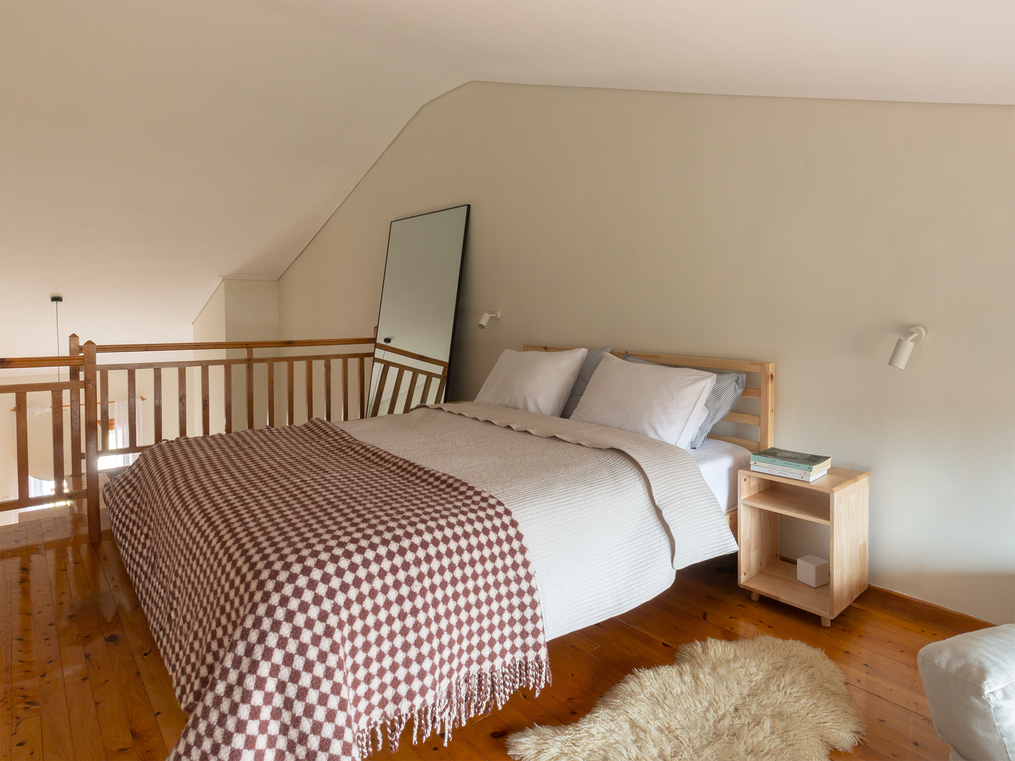 In place of a television, the loft features a projector — intentionally chosen to enhance quiet, cinematic evenings while preserving the calm character of the space.