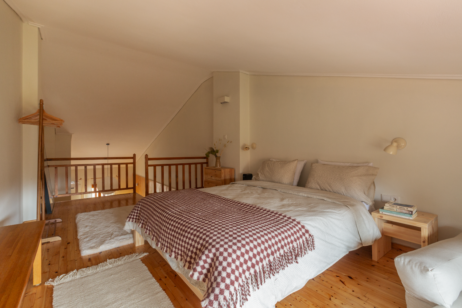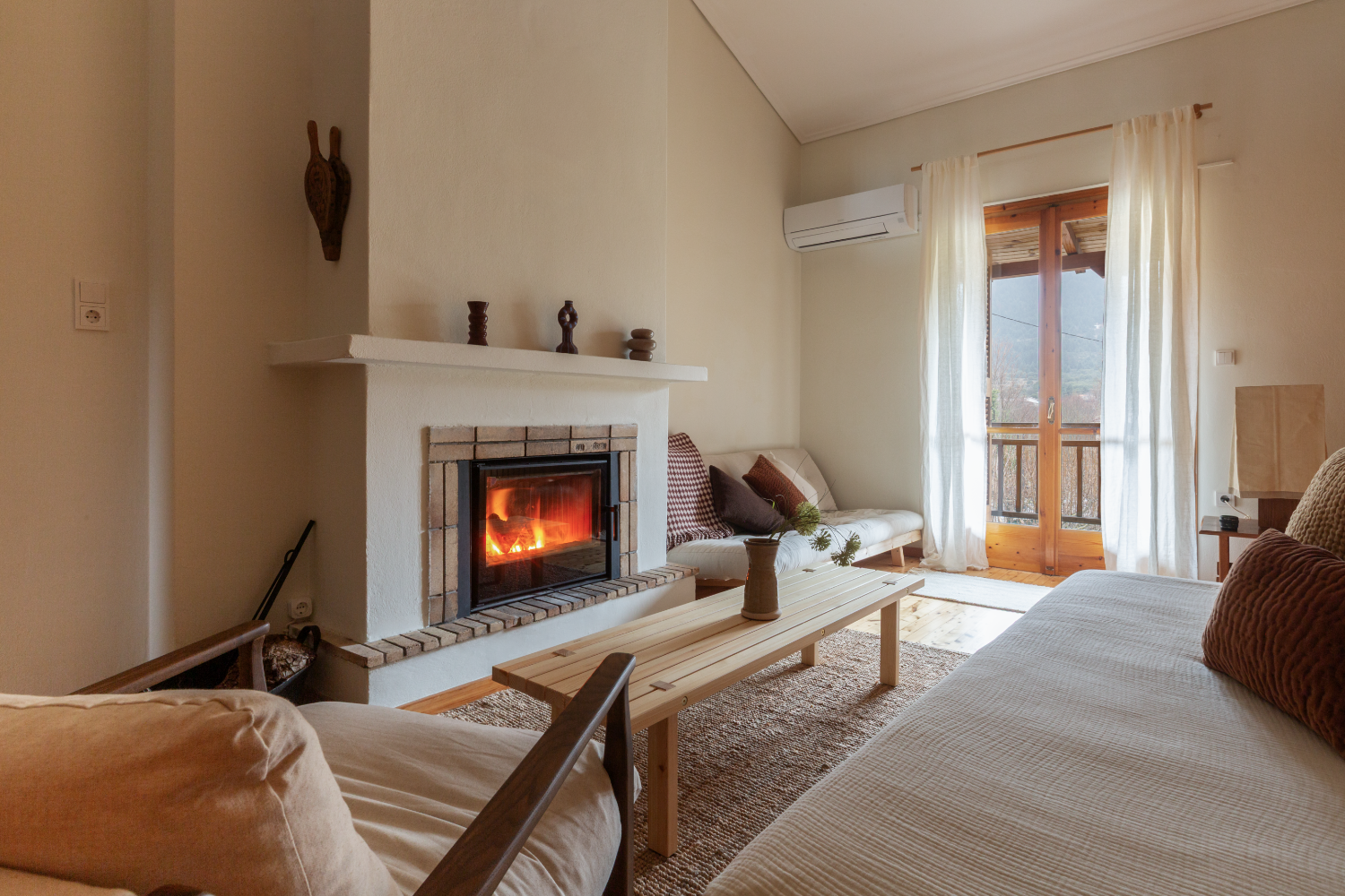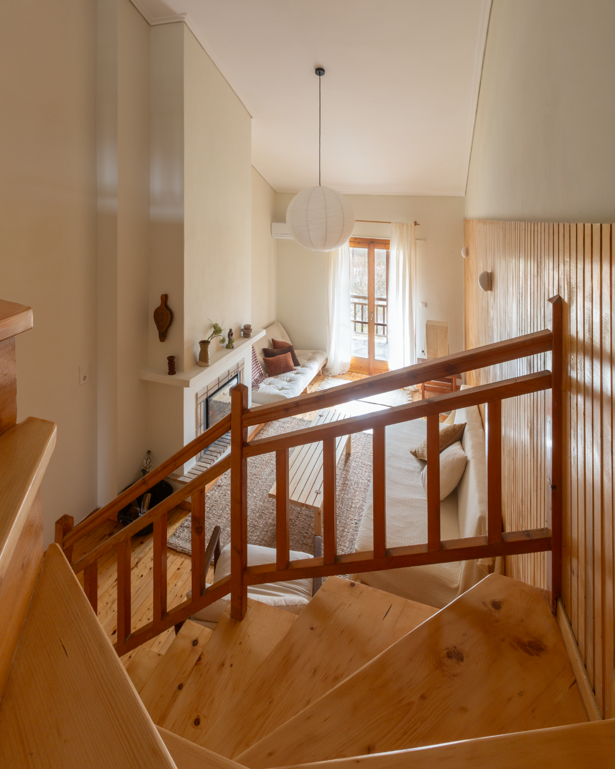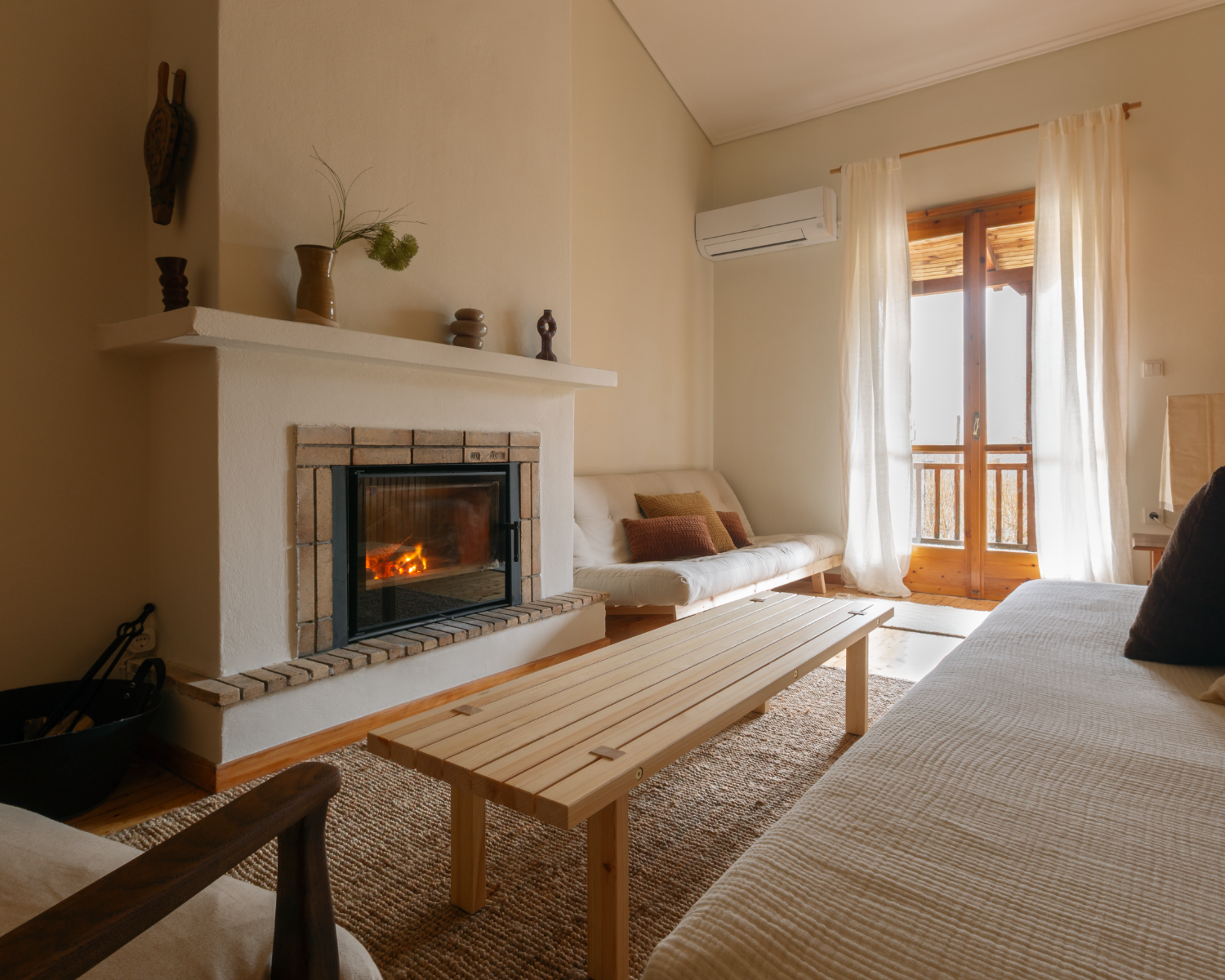 Arranged across two levels with an open-plan layout, the loft pairs an upper mezzanine sleeping area with a softly lit living space below. Darker wood accents and a slightly more intimate layout create a warmer, atmospheric feel — especially after a day exploring the Menalon Trail or wandering through Vytina’s stone streets. In the evenings, the fireplace draws you in, creating the perfect setting for slow conversations and a glass of wine.