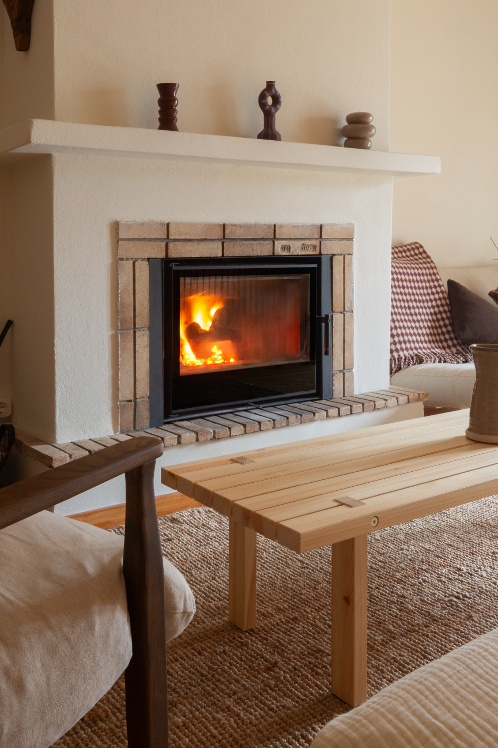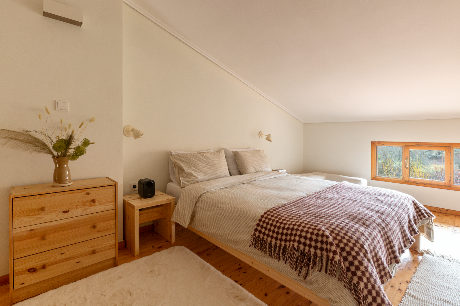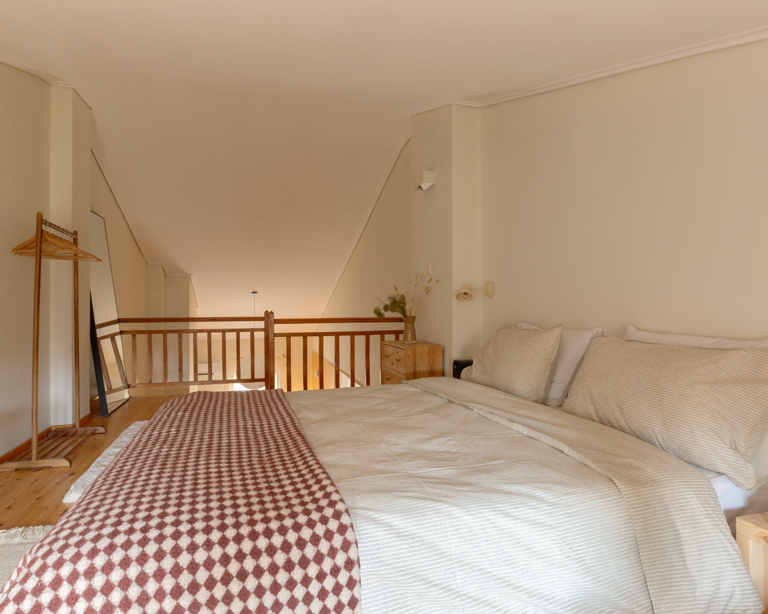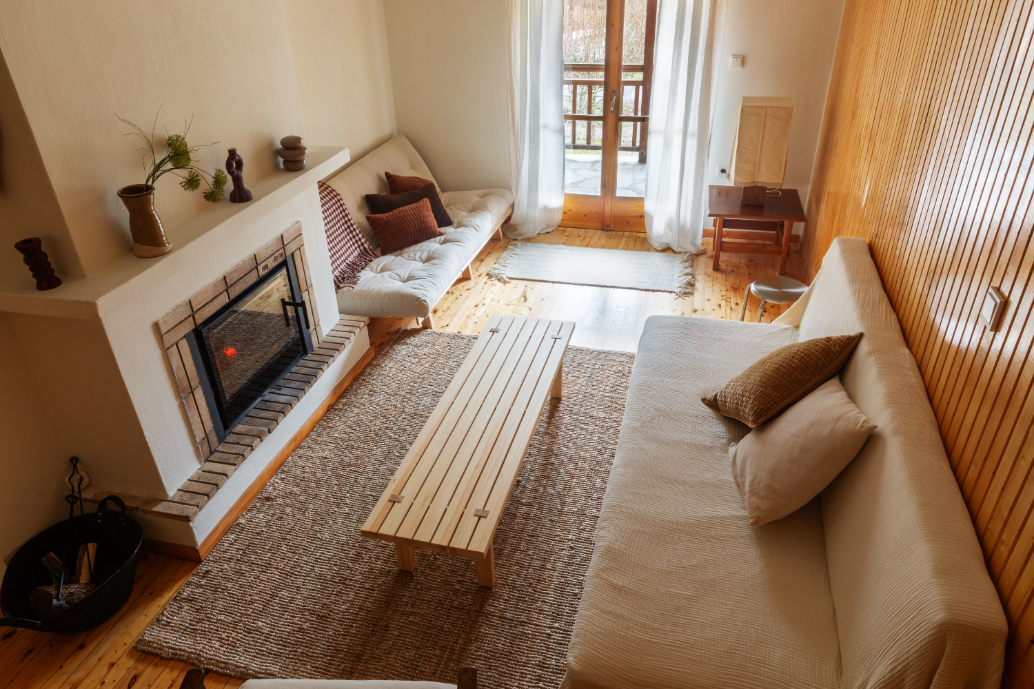 Arranged across two levels with an open-plan layout, the loft pairs an upper mezzanine sleeping area with a softly lit living space below. Darker wood accents and a slightly more intimate layout create a warmer, atmospheric feel — especially after a day exploring the Menalon Trail or wandering through Vytina’s stone streets. In the evenings, the fireplace draws you in, creating the perfect setting for slow conversations and a glass of wine.