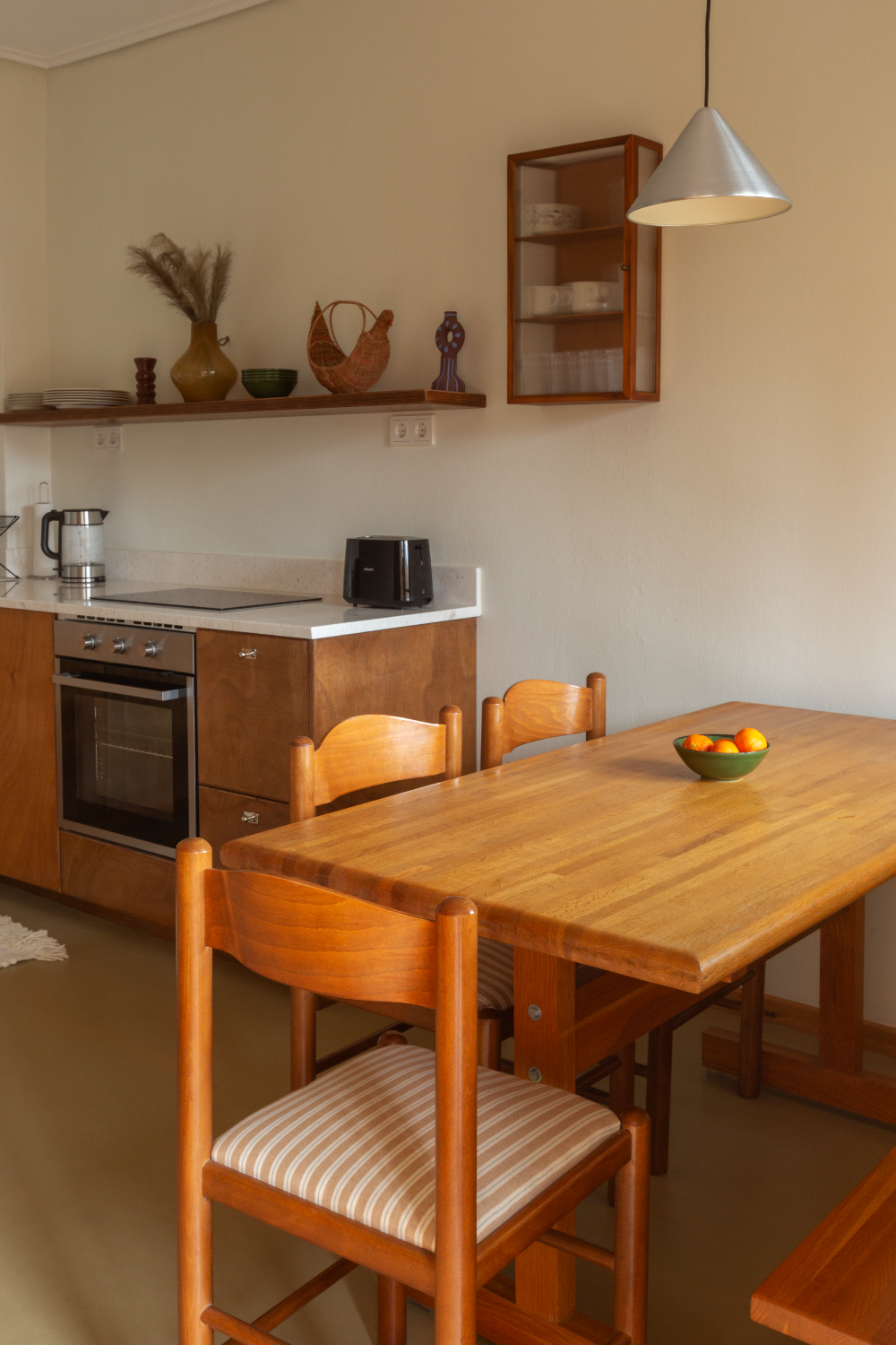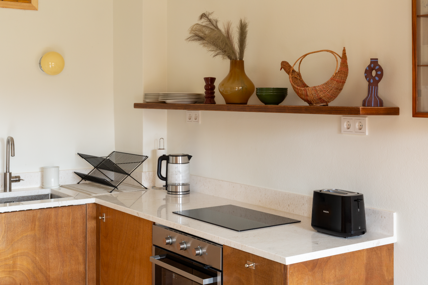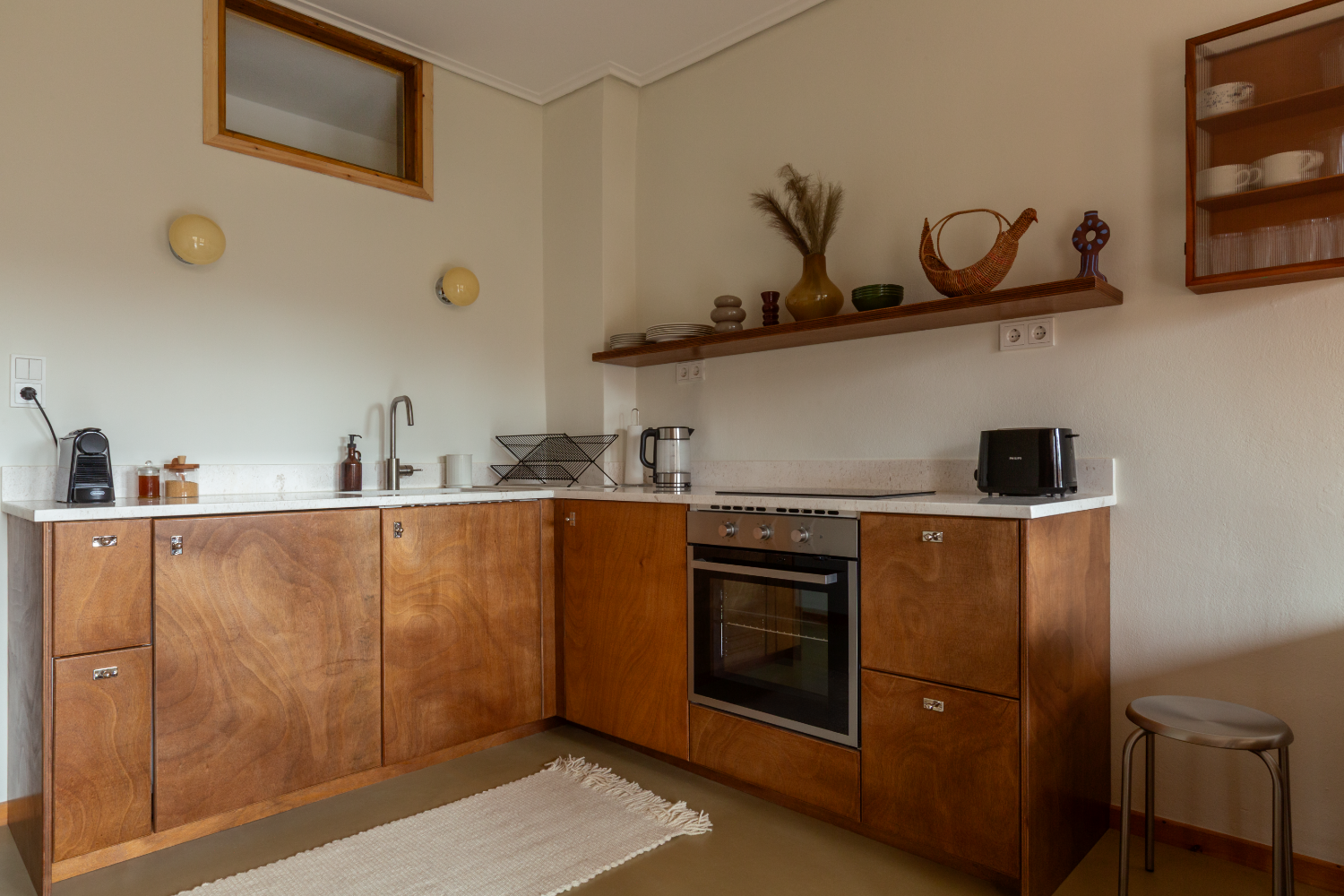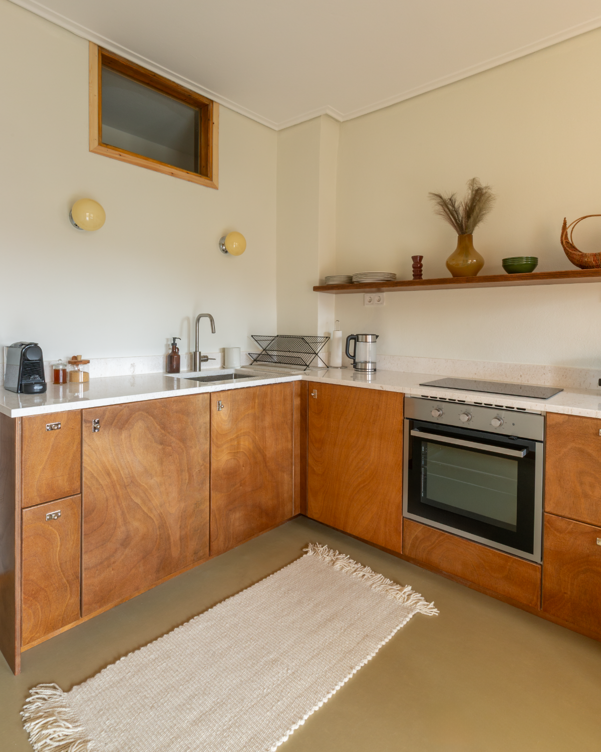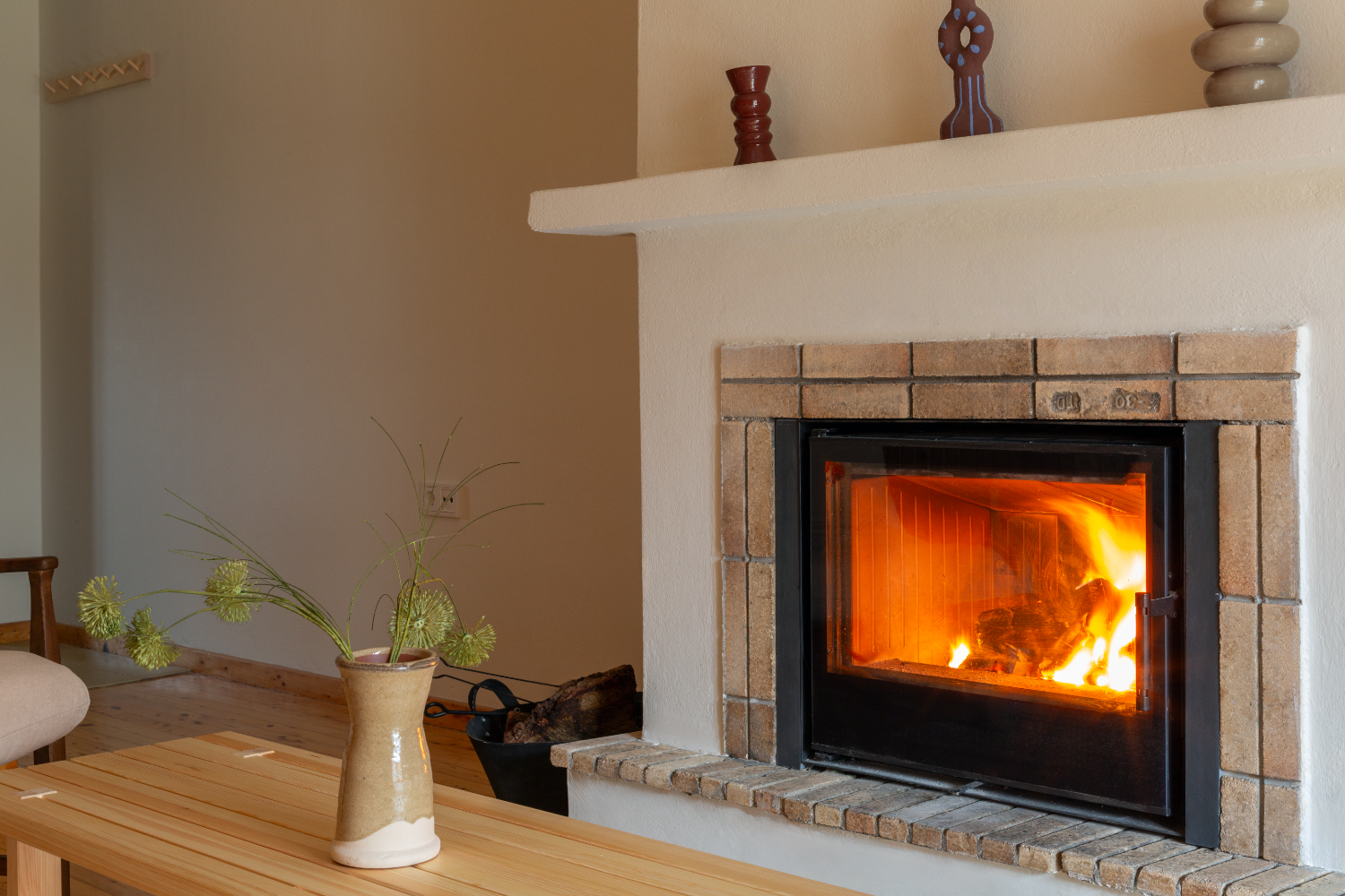 Arranged across two levels with an open-plan layout, the loft pairs an upper mezzanine sleeping area with a softly lit living space below. Darker wood accents and a slightly more intimate layout create a warmer, atmospheric feel — especially after a day exploring the Menalon Trail or wandering through Vytina’s stone streets. In the evenings, the fireplace draws you in, creating the perfect setting for slow conversations and a glass of wine.