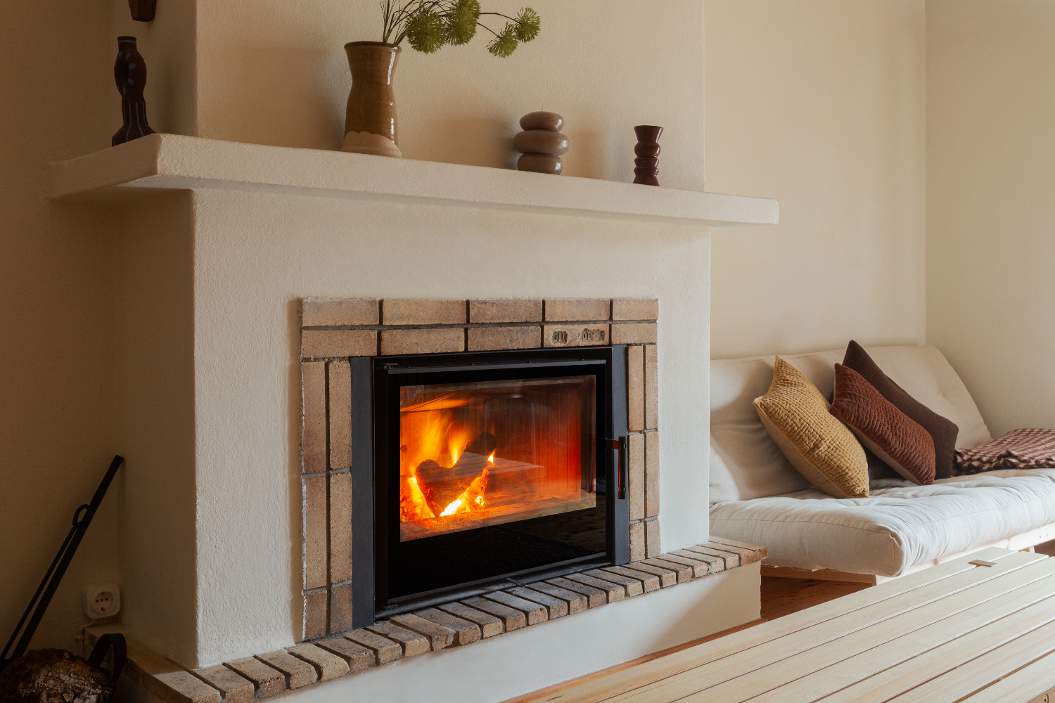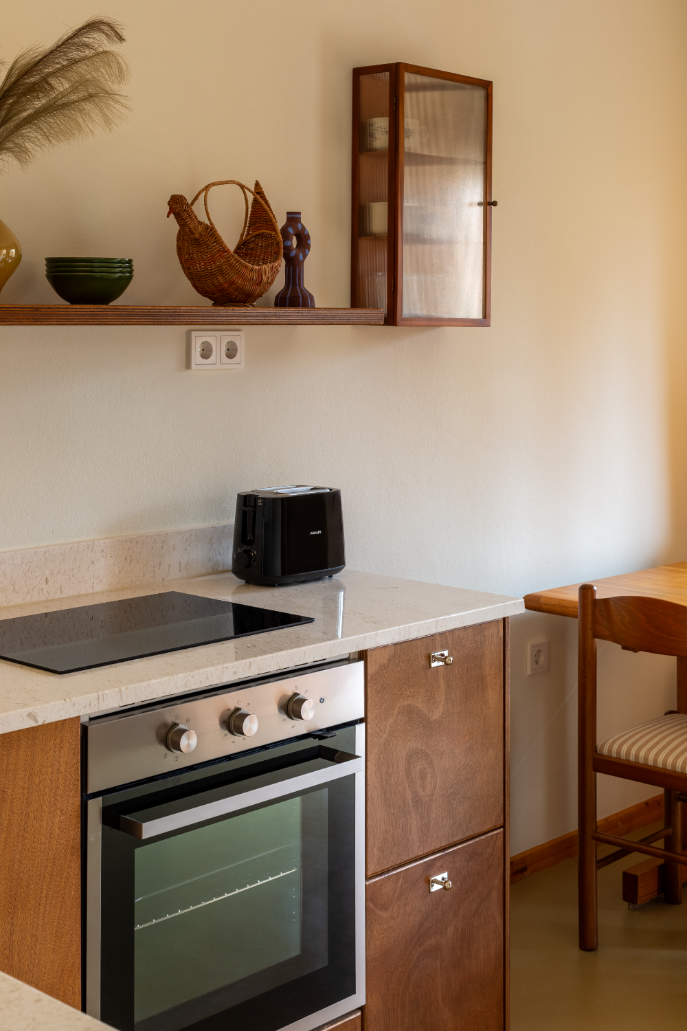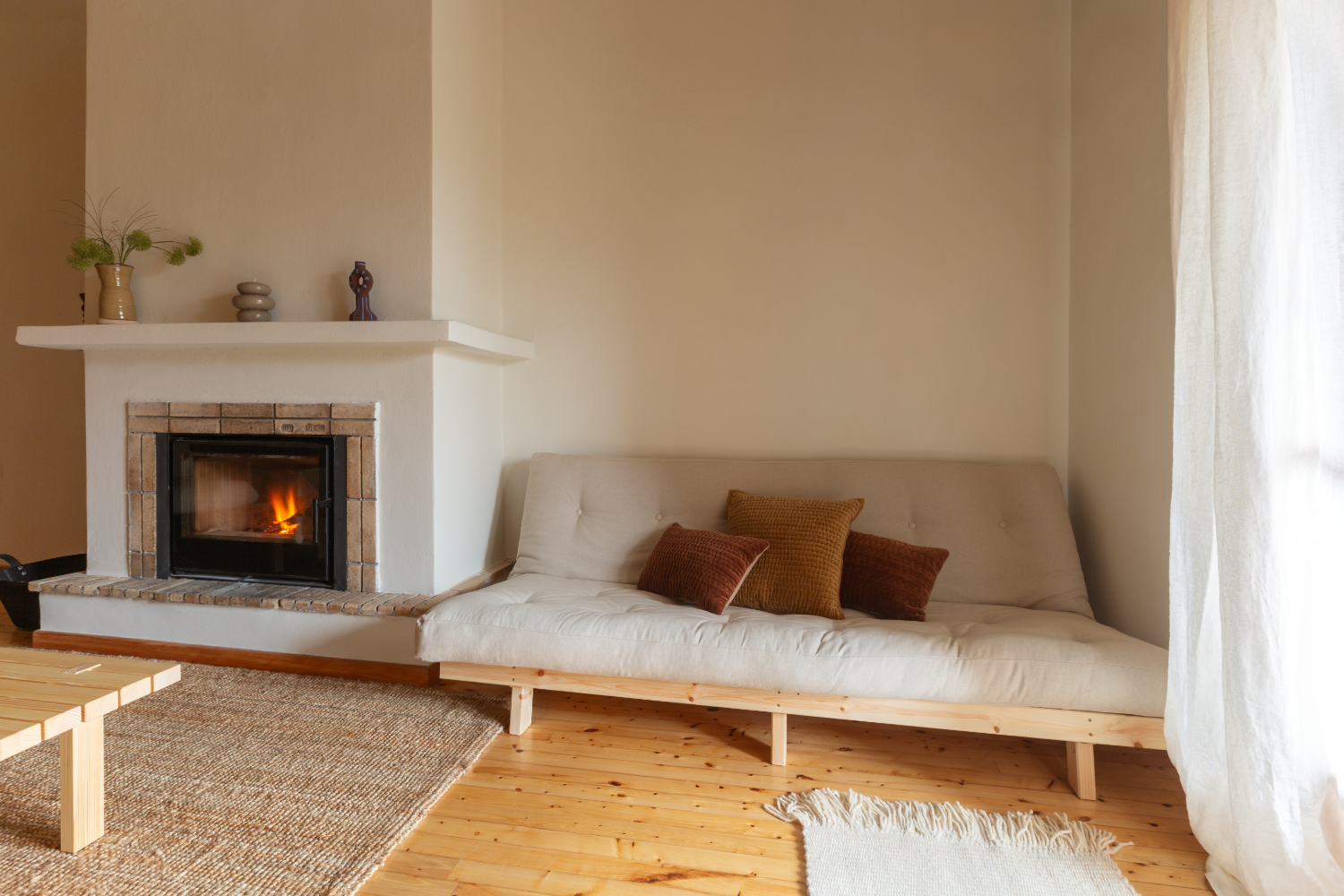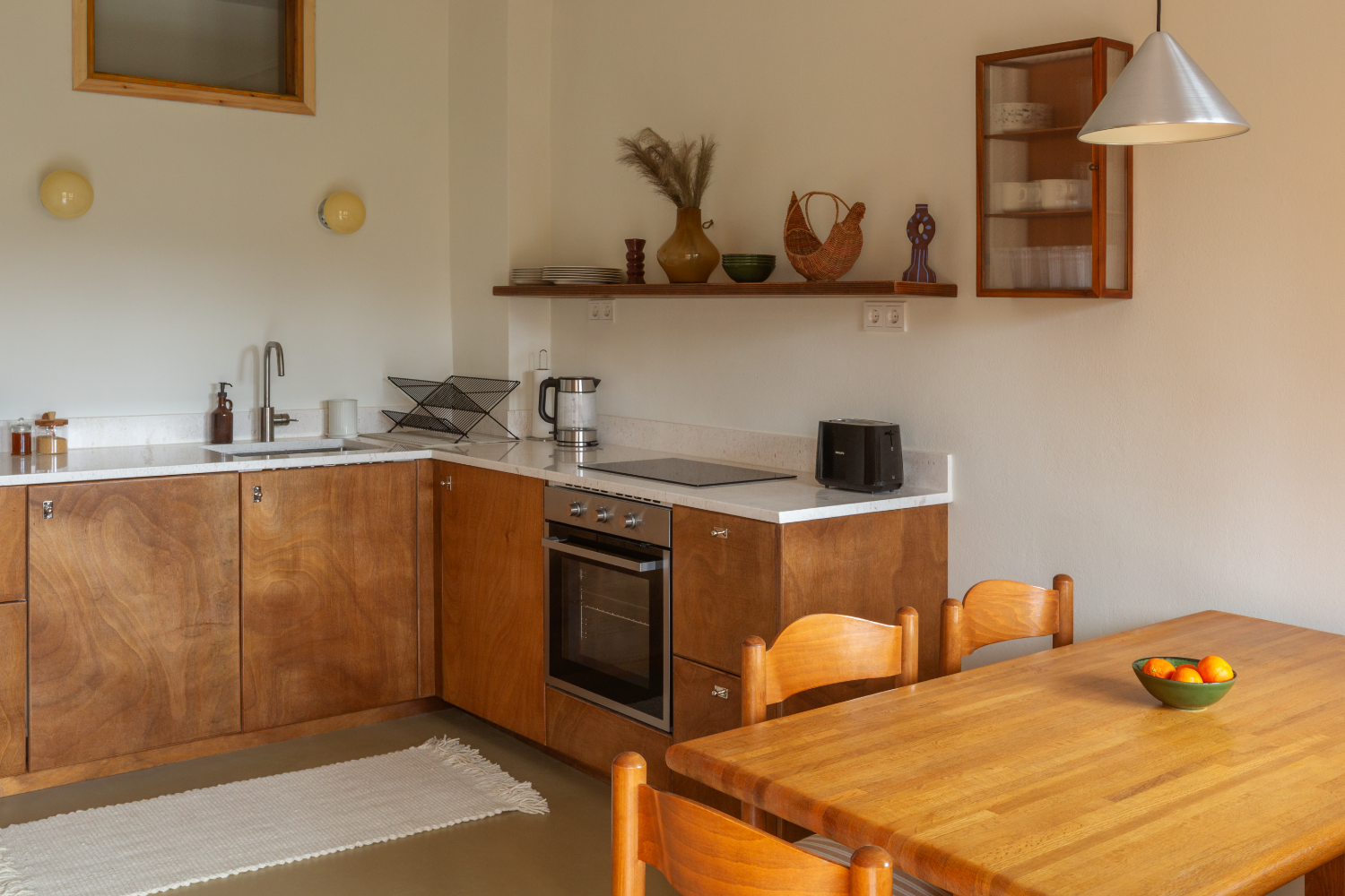 Arranged across two levels with an open-plan layout, the loft pairs an upper mezzanine sleeping area with a softly lit living space below. Darker wood accents and a slightly more intimate layout create a warmer, atmospheric feel — especially after a day exploring the Menalon Trail or wandering through Vytina’s stone streets. In the evenings, the fireplace draws you in, creating the perfect setting for slow conversations and a glass of wine.