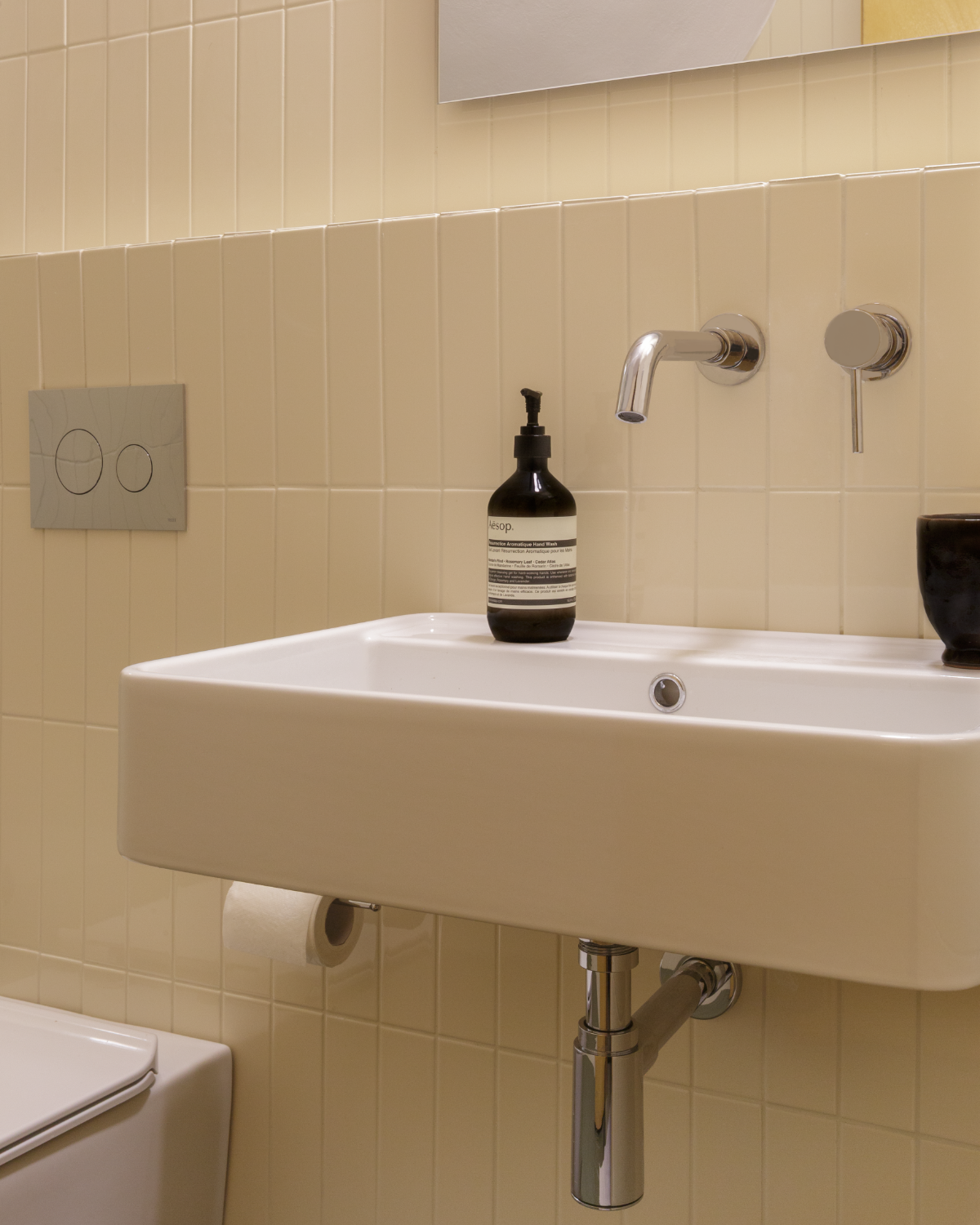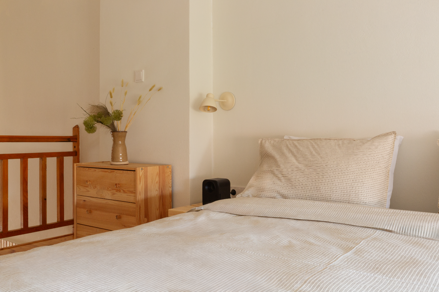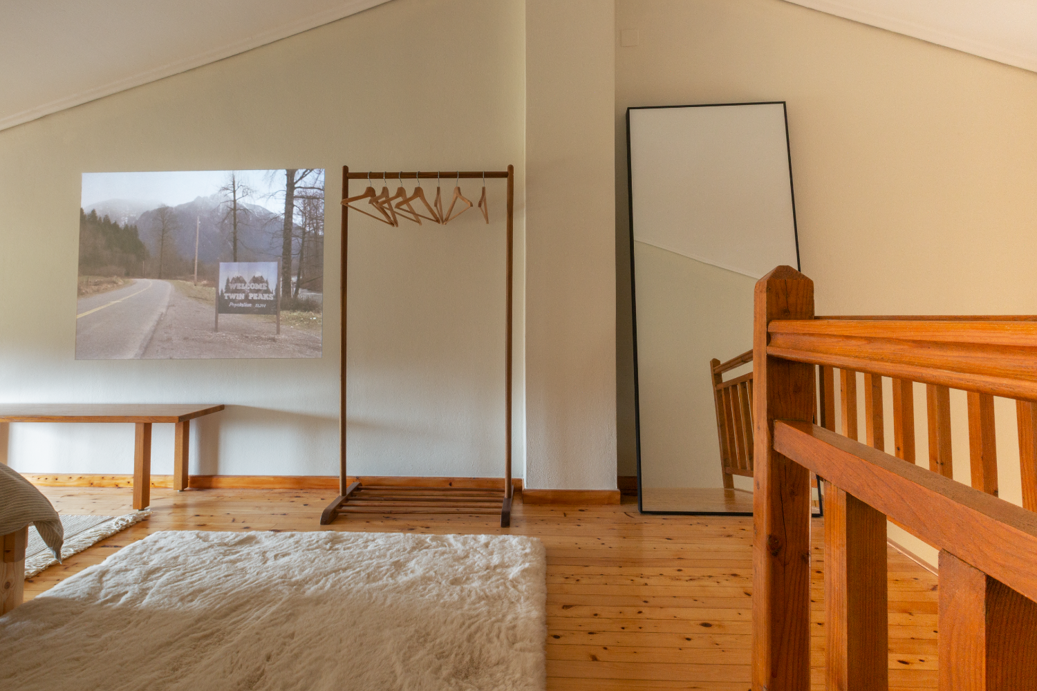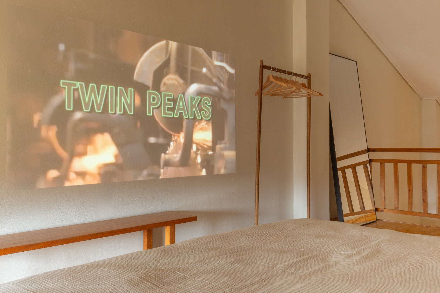 In place of a television, the loft features a projector, an intentional detail that enhances cinematic evenings while preserving the calm aesthetic of the space.