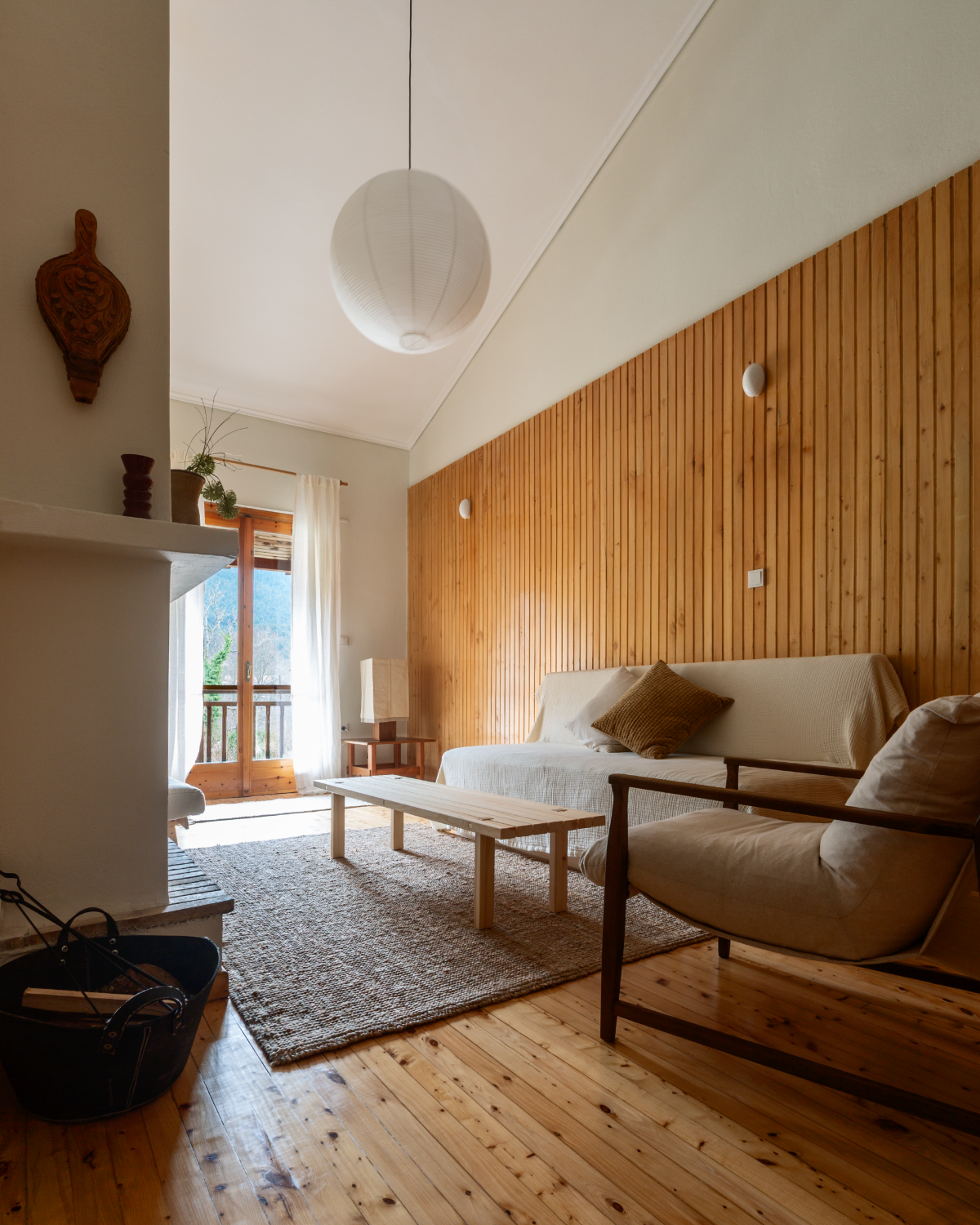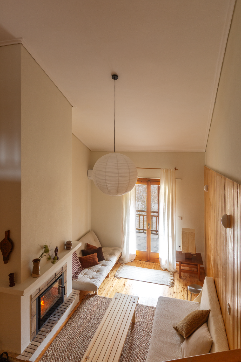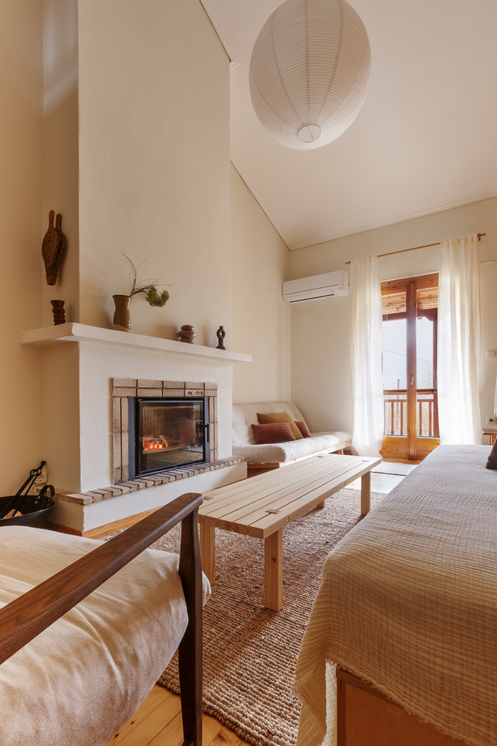 Richer in tone and more intimate in ambiance, Daphne is a warm mountain retreat designed for fresh mountain mornings and quiet fireside evenings.Located directly on Vytina’s scenic Path of Love, it’s just a short walk from the village, yet peacefully surrounded by forest calm.